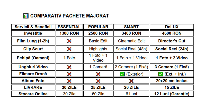 Beneficii: Sistem 3 Camere video (1 cam fixă), Album Photobook Premium (20x20 cm), Social Reel în 24h, Filmare cu Dronă, Livrare rapidă (15 zile lucrătoare), Garanție stocare 12 luni.
